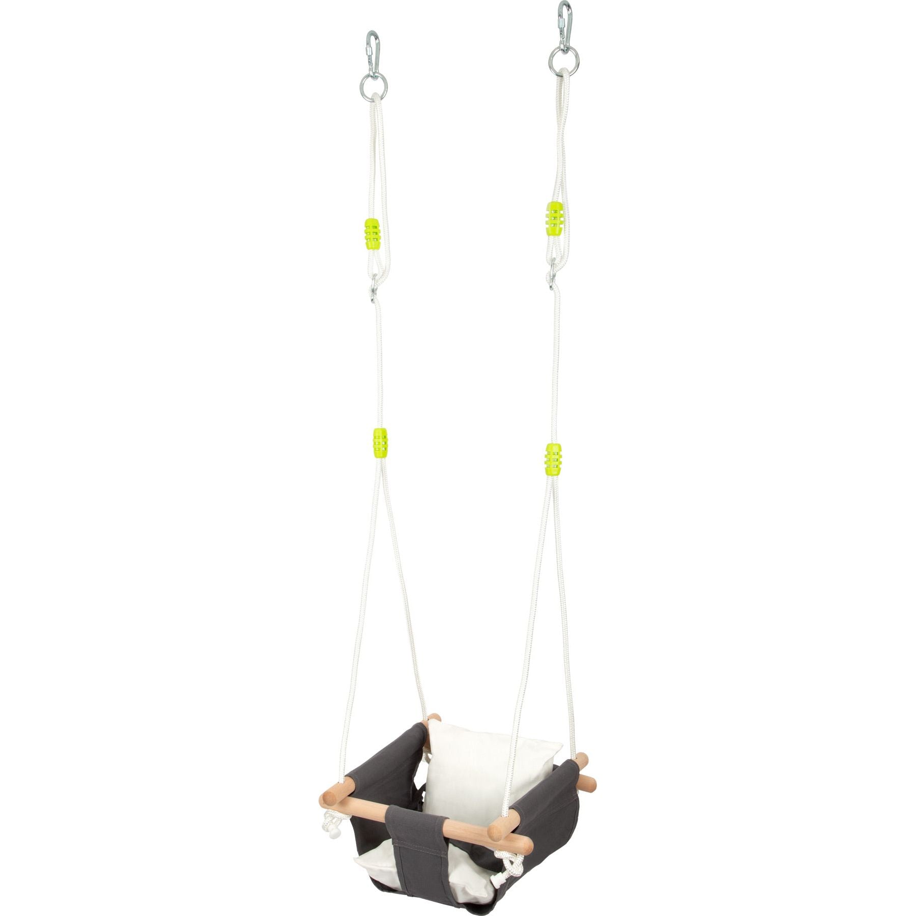 With robust, length-adjustable ropes and metal rings as well as screw carabiners for hanging and mounting. And this swing grows with them! The seat can be made smaller with the cushion, which is ideal for younger children aged 18 months and up. Later, the cushion can be removed