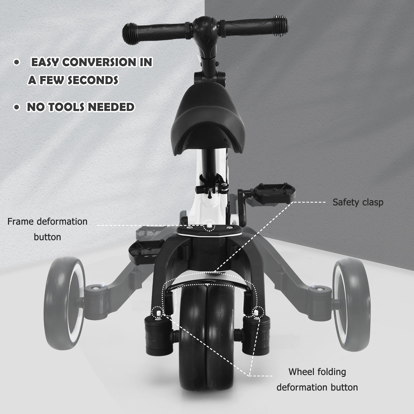 3-in-1 Design to Gain More Fun: The multifunctional bike is designed for kids from 1 to 4 years old to meet their entertainment needs at different stages. Generally, it works as a safe three-wheel kids' pedal tricycle. When two rear wheels are folded, it becomes a challenging two-wheel balance bike. Also, it can be a three-wheel baby walker by removing the pedals.