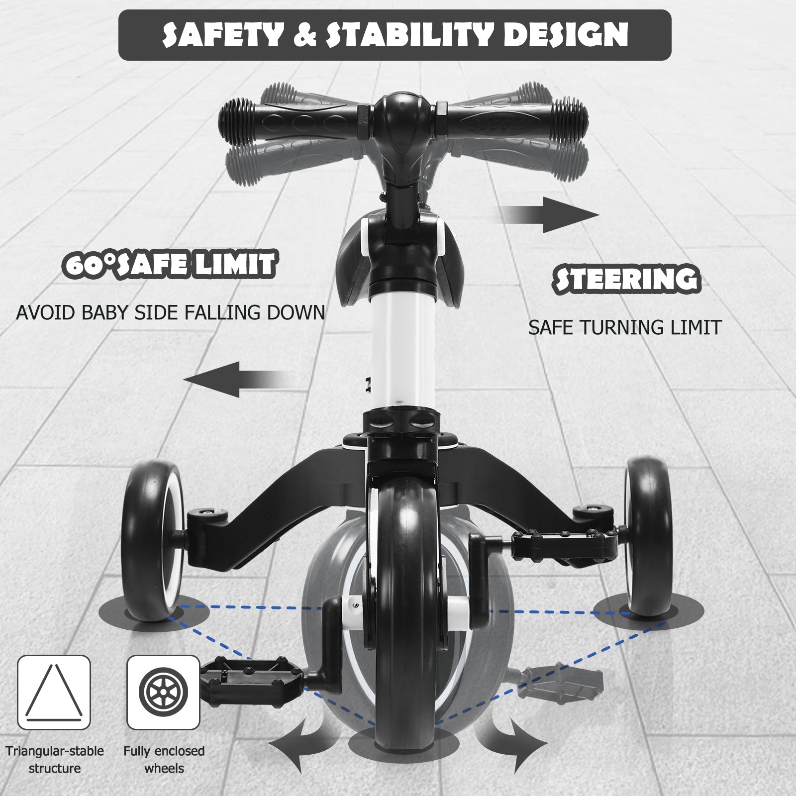 Limited Angle for Ensured Safety: For actual riding needs, the handle can be adjusted to the normal position, 35° backward, 35° forward, or 90° forward. At the same time, it also comes with a considerate angle limitation of 60° to make sure that kids won’t fall and get injured because of too large a turning angle.