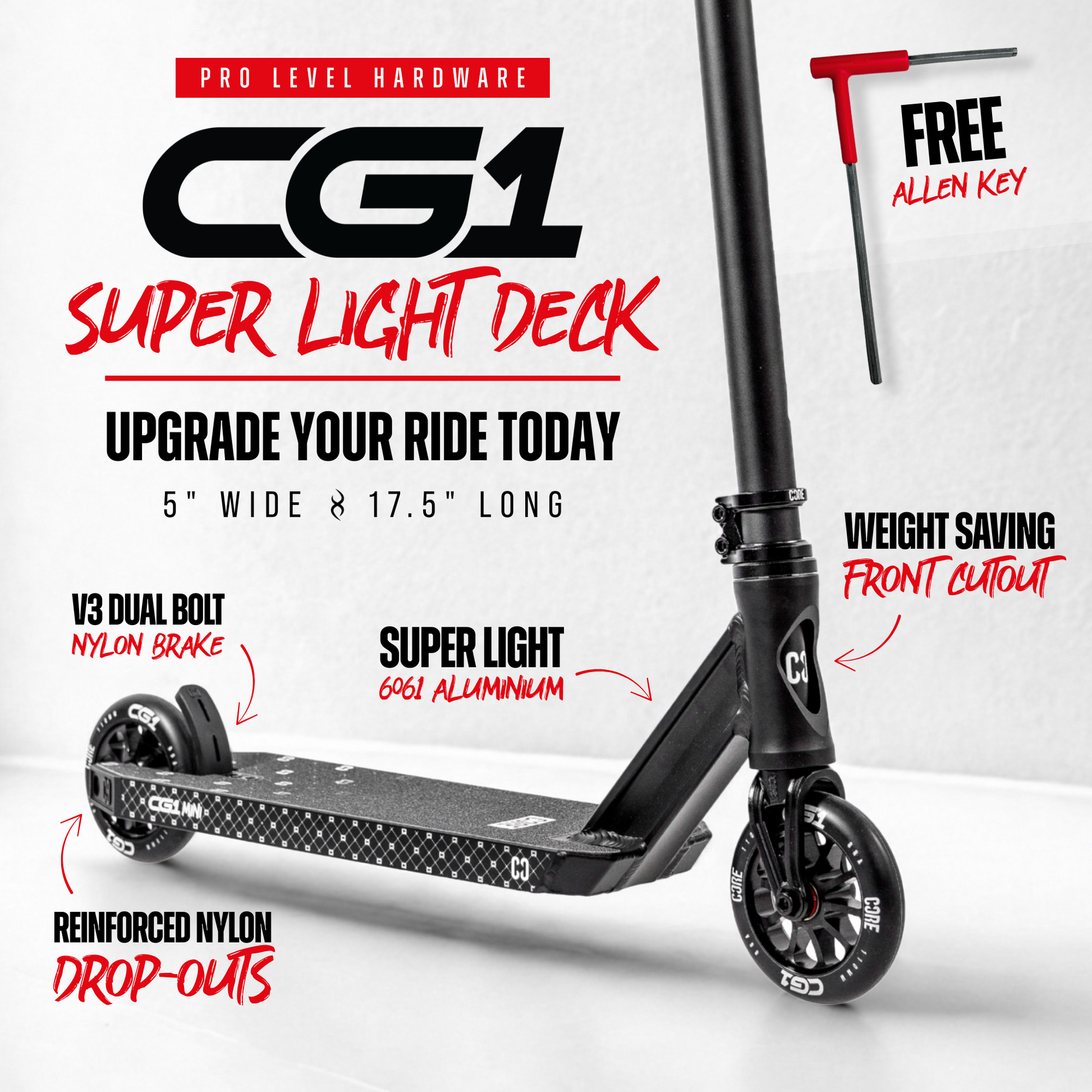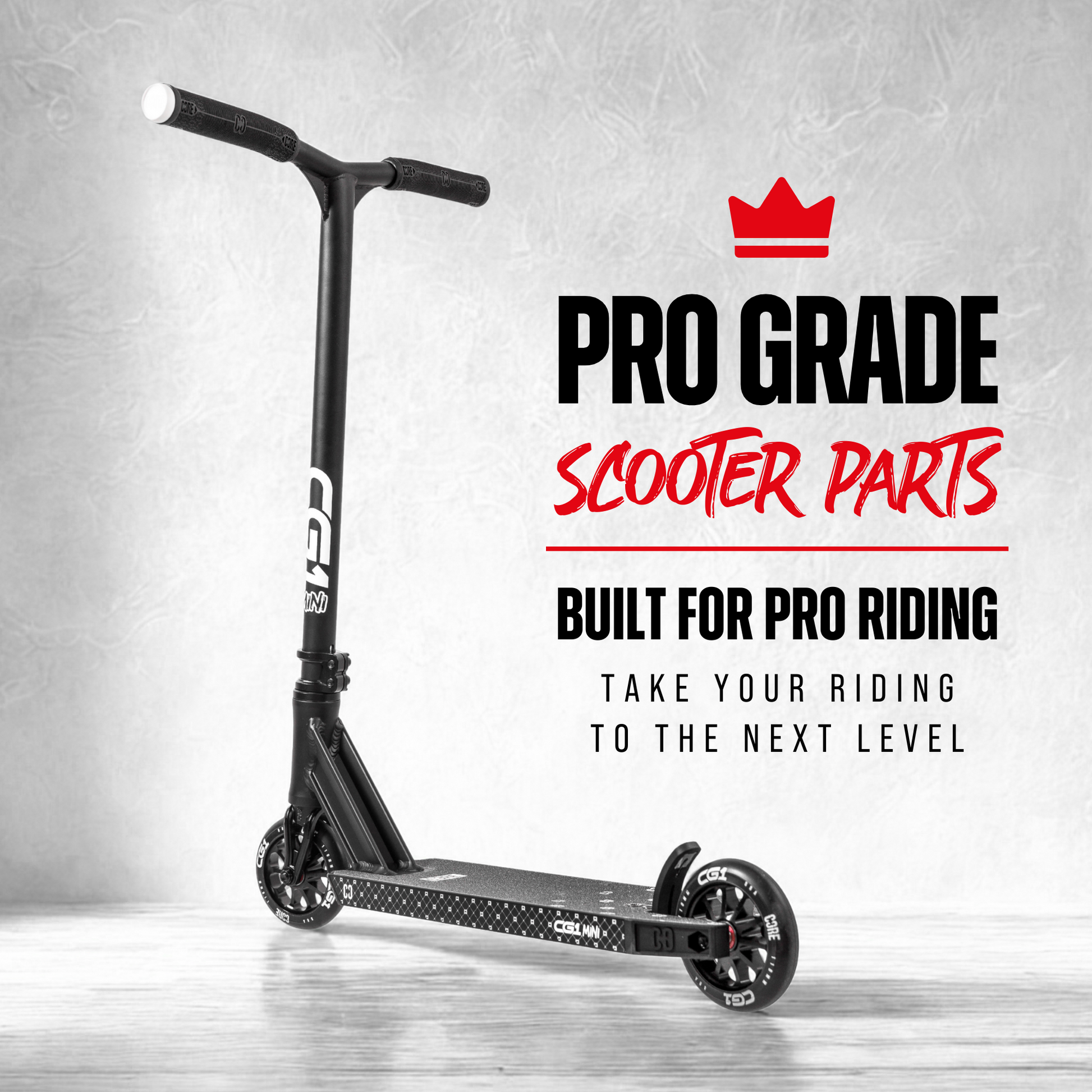 Whether you’re a beginner looking to learn your first tricks or an intermediate rider doing flips, the CG1’s got you covered. The Perfect size to weight ratio makes this Scooter Great for Newbies or Smaller Riders who want to go Pro. A professional Grade scooter scaled down to fit Beginners.