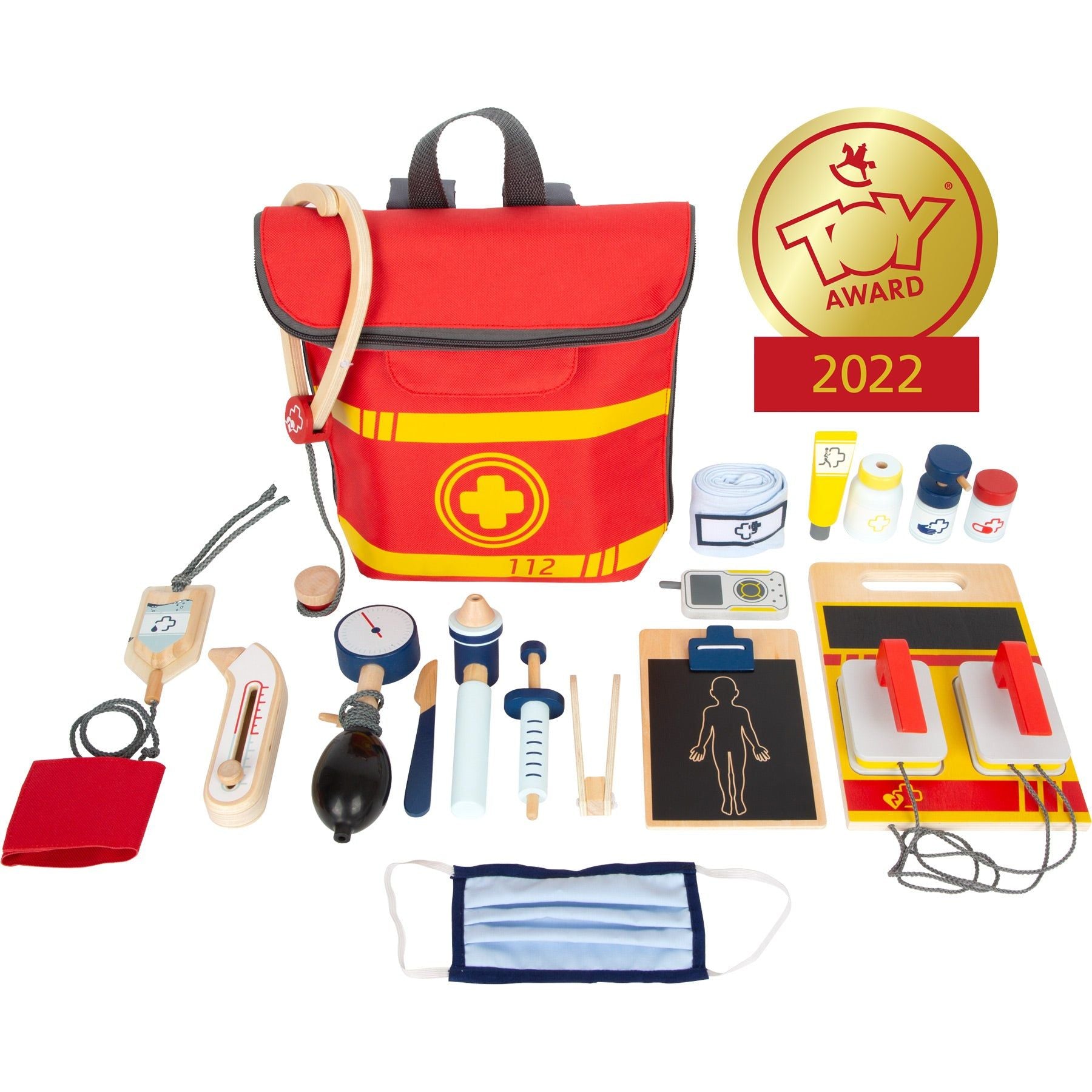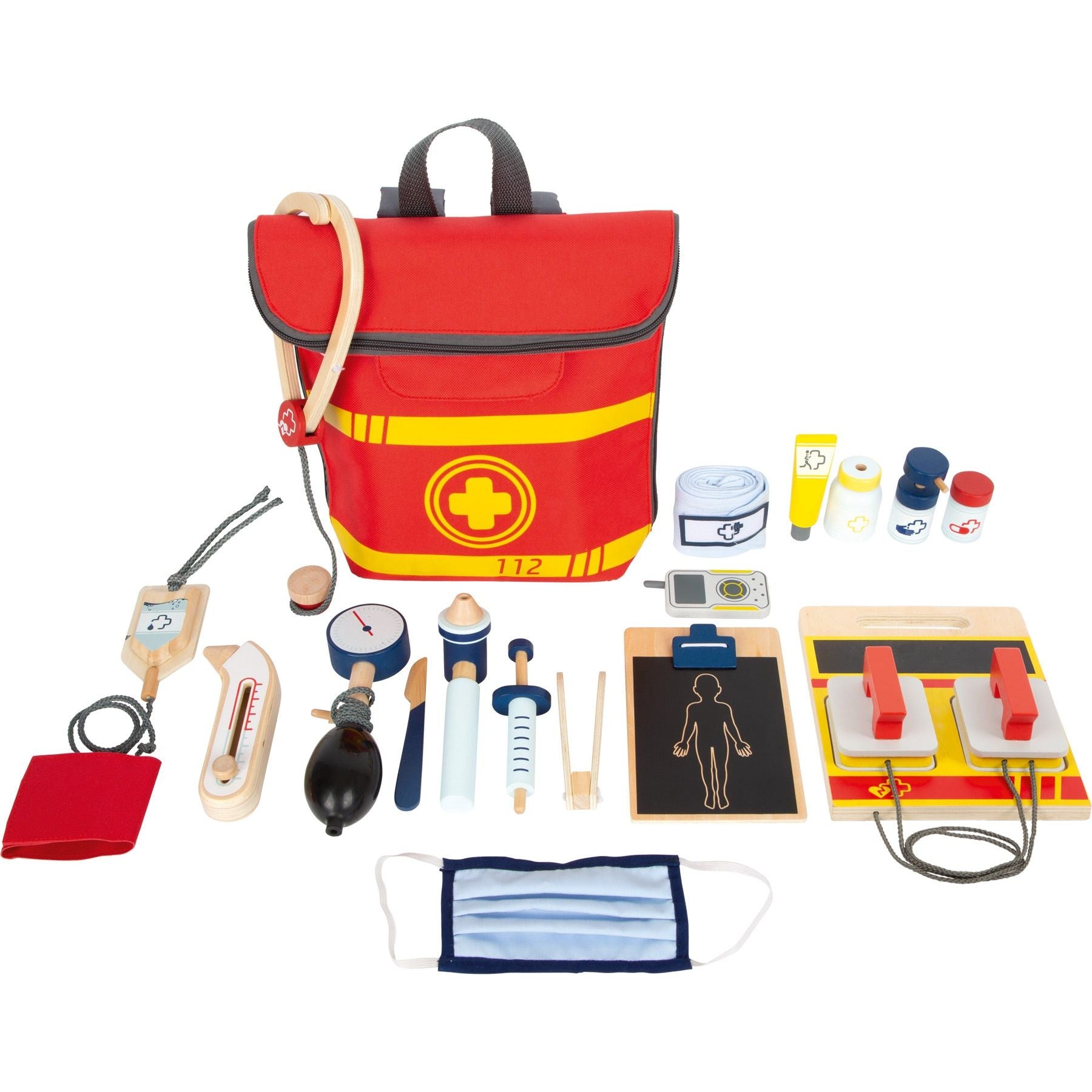 An all-in-one for emergencies! With this realistic rescue kit in emergency signal colours with adjustable straps, all young, aspiring first responders have plenty of "real" tools and utensils from the medical industry at hand. The double zipper and elastic insert slots in the backpack provide order and quick access to the emergency equipment made of robust wood! The absolute highlights of this emergency doctor play kit are the blood pressure gauge with a pump ball, the otoscope with a real magnifying glass, and the toy defibrillator with a chalkboard!