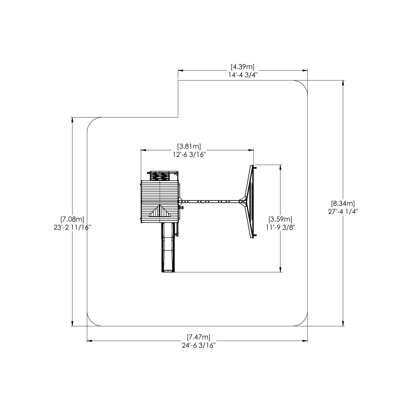 - Obsticale free safty zone: 24 ft 6 3/16 in (7.47 m) L x 27 ft 4 1/4 in (8.34 m) area requires protective surfacing.