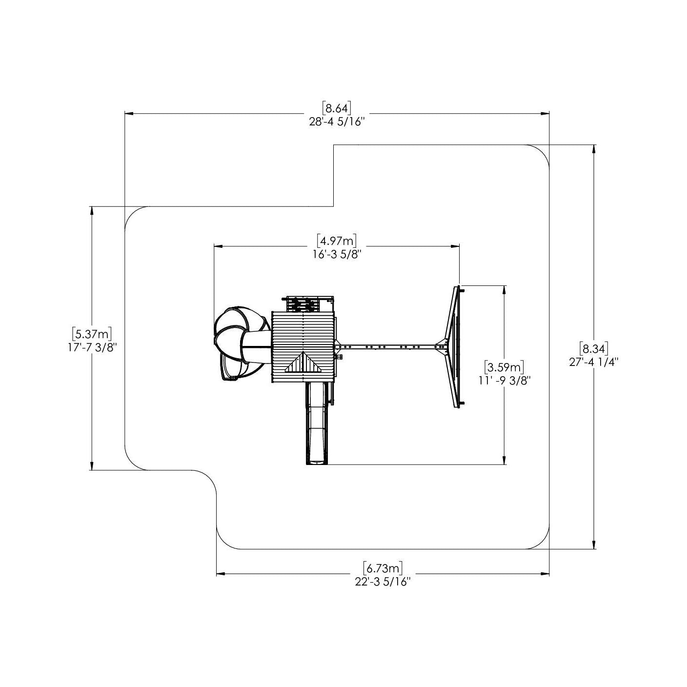 - Obstacle free safety zone: 28 ft 4 5/16 in (8.64 m) L x 27 ft 4 1/4 in (8.34 m) area requires protective surfacing.