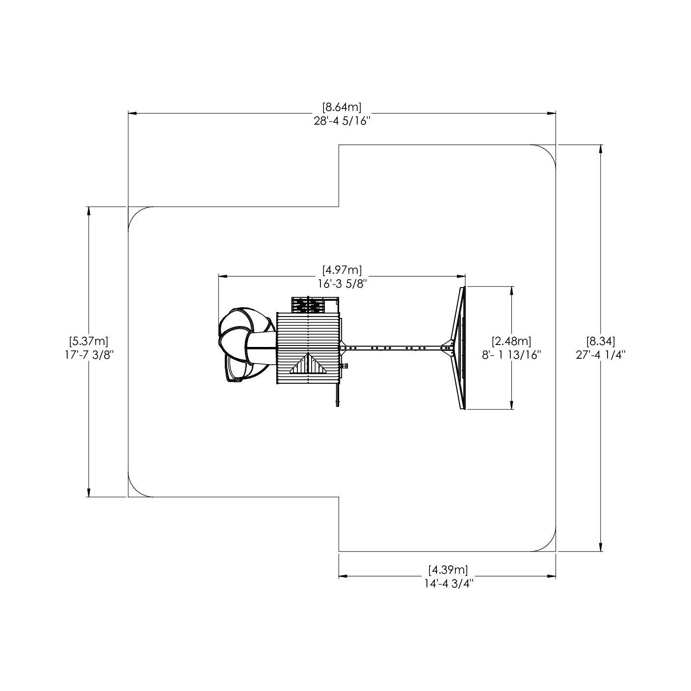 - Overall playset dimensions: 16 ft 3 5/8 in (4.97 m) L x 8 ft 1 3/16 in (2.48 m) W x 10 ft 1/2 in (3.06 m) H