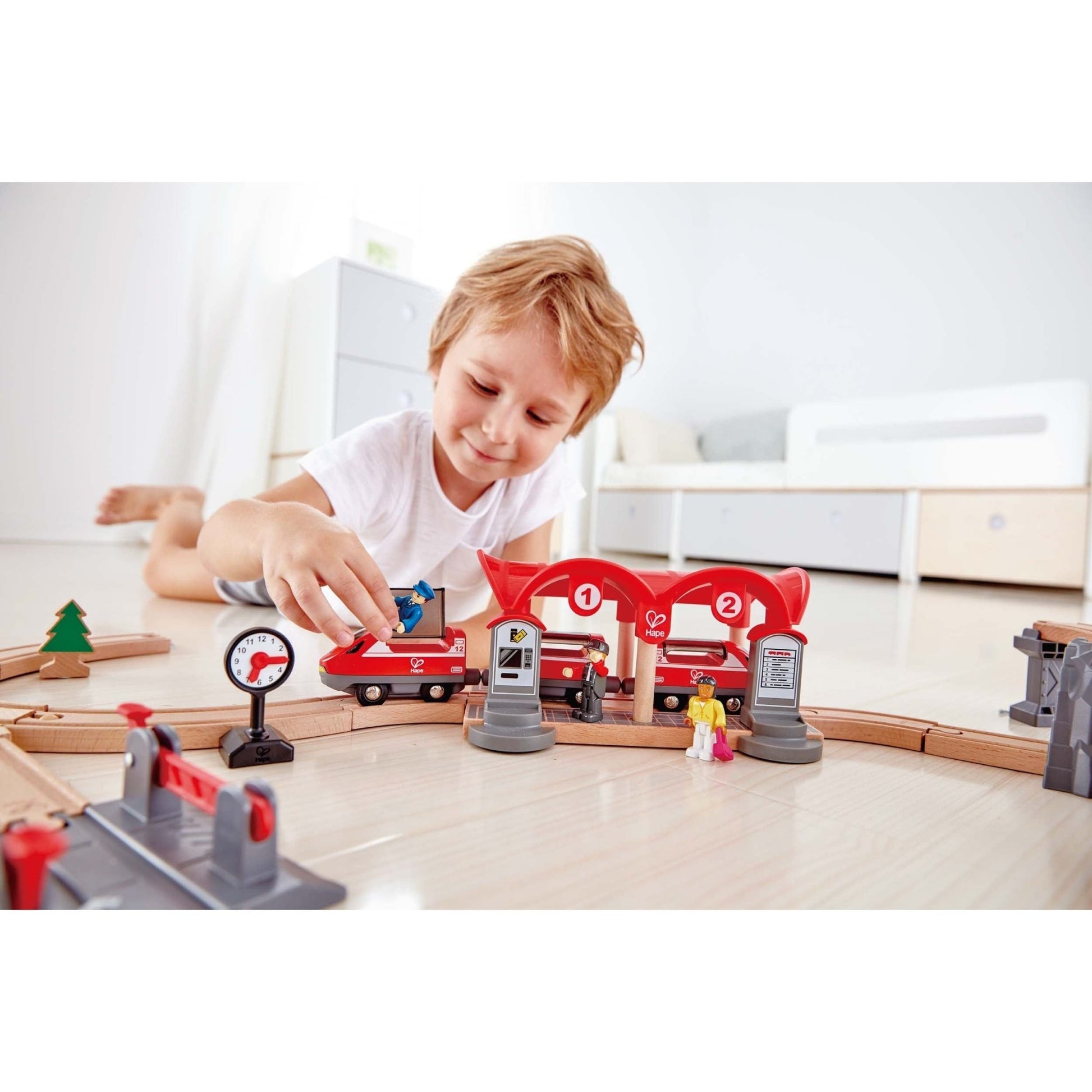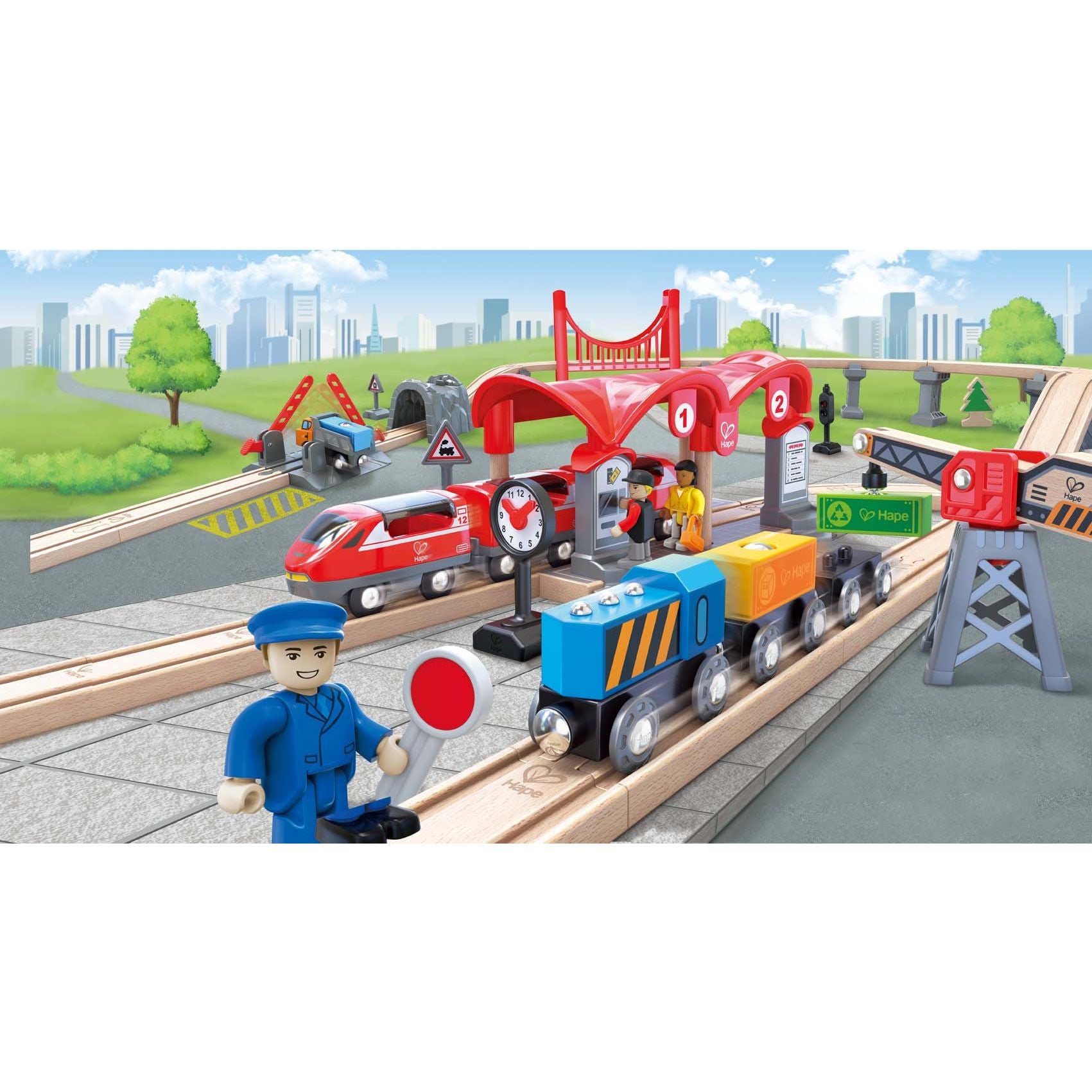Train tracks aren’t just for passenger trains. There’s freight to deliver, too! The Hape Busy City Railway Set is a double-loop city-themed railway set features a passenger train and a freight train, a station, automatic gates, a bridge and much more!