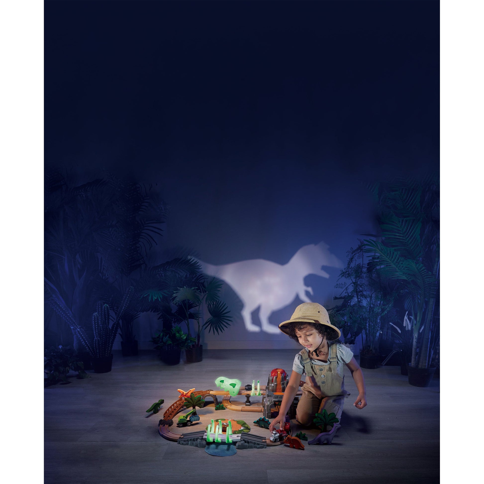 Embark on a glowing adventure with the Hape Dino Railway Adventure Set. Watch as dinosaur-themed elements come to life to create a mesmerising railway journey.