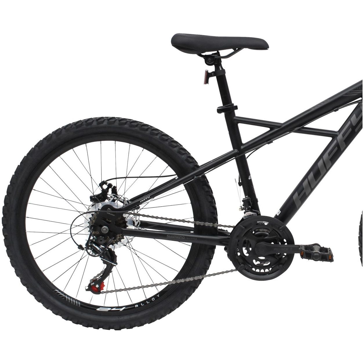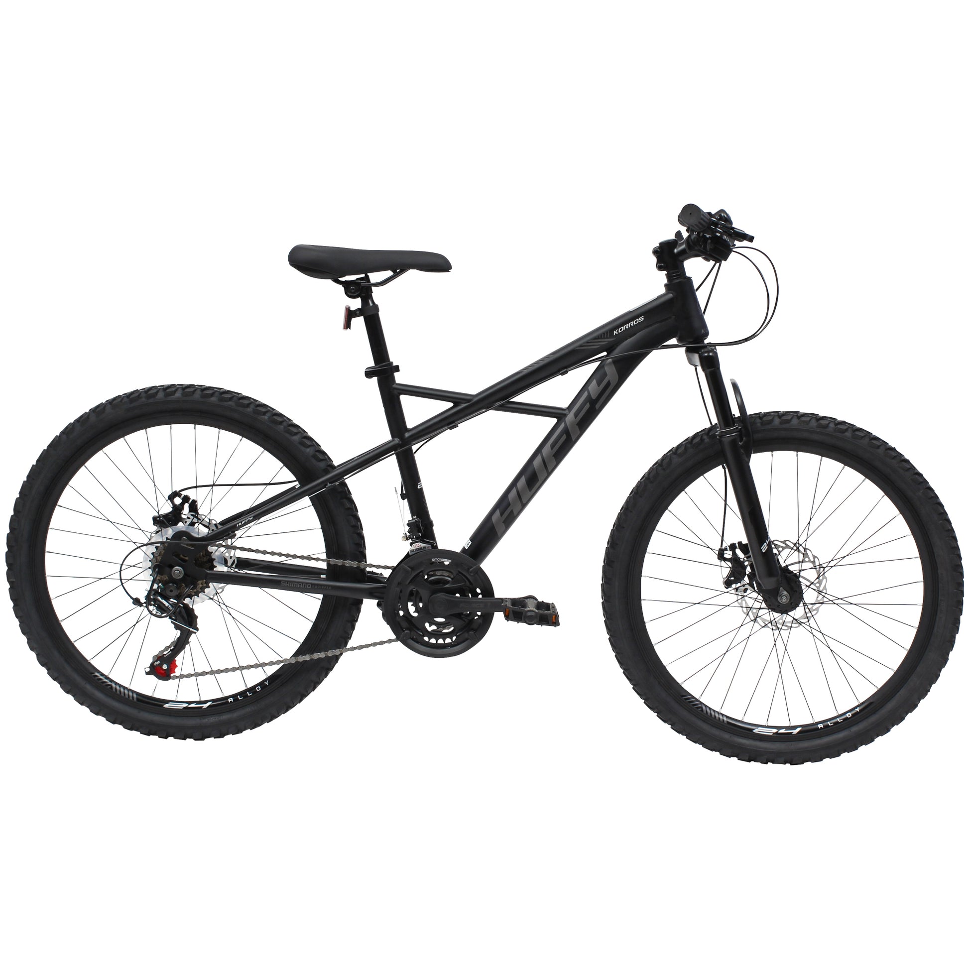 The completely new X-frame design of the Huffy Korros is the perfect mountain bike for boys with 21 Shimano gears and 24" alloy wheels. Deviating from the familiar paths is an exciting experience for every cyclist. Finished ina stylish all black colour, the Huffy Boys 24" Korros Mountain Bikes is a bicycle that is suitable for difficult terrains and trails. The new Korros series is made for regular cycling tours but also for rougher terrain and trails.