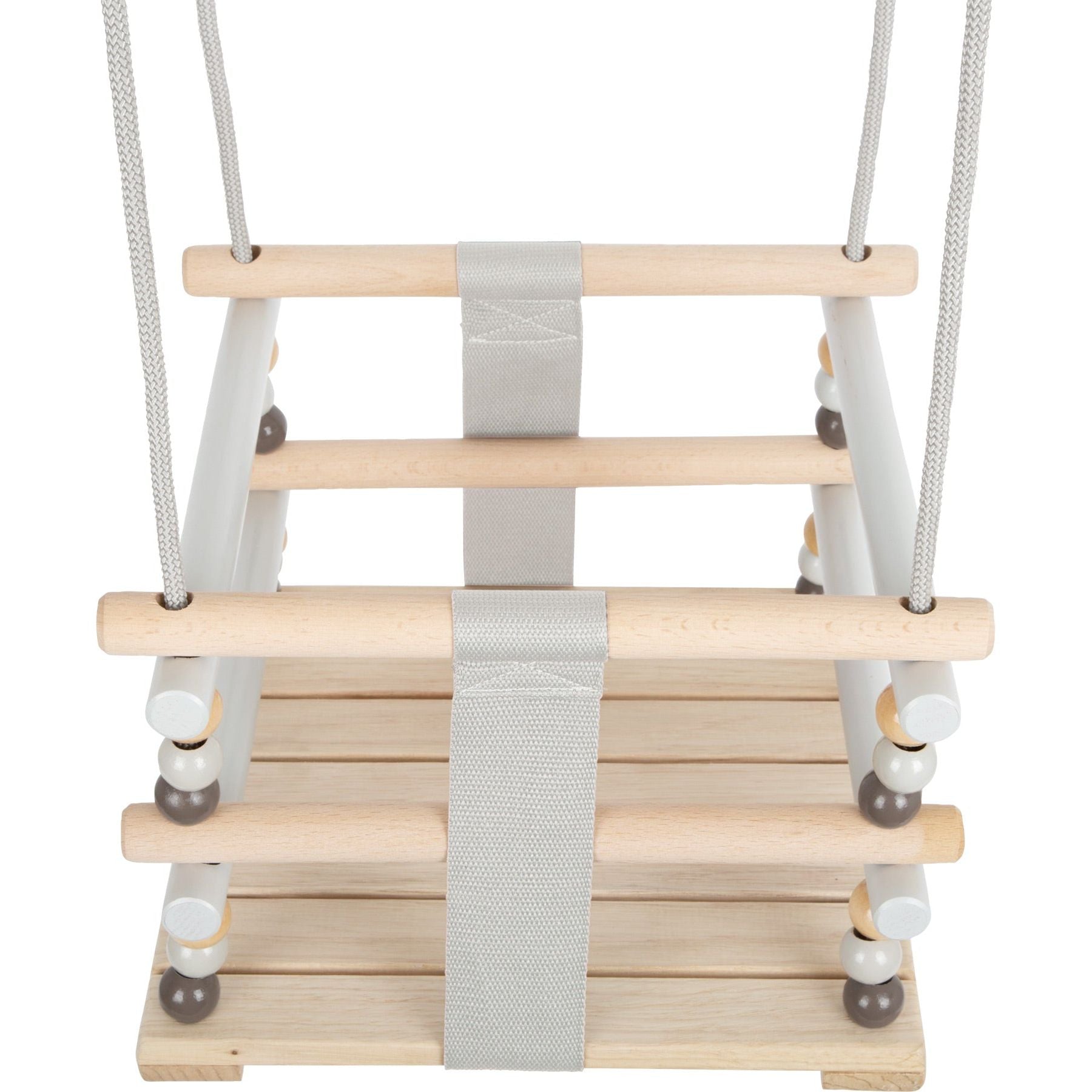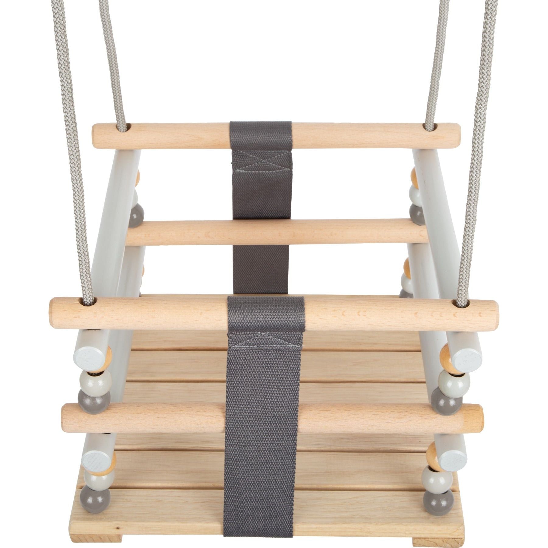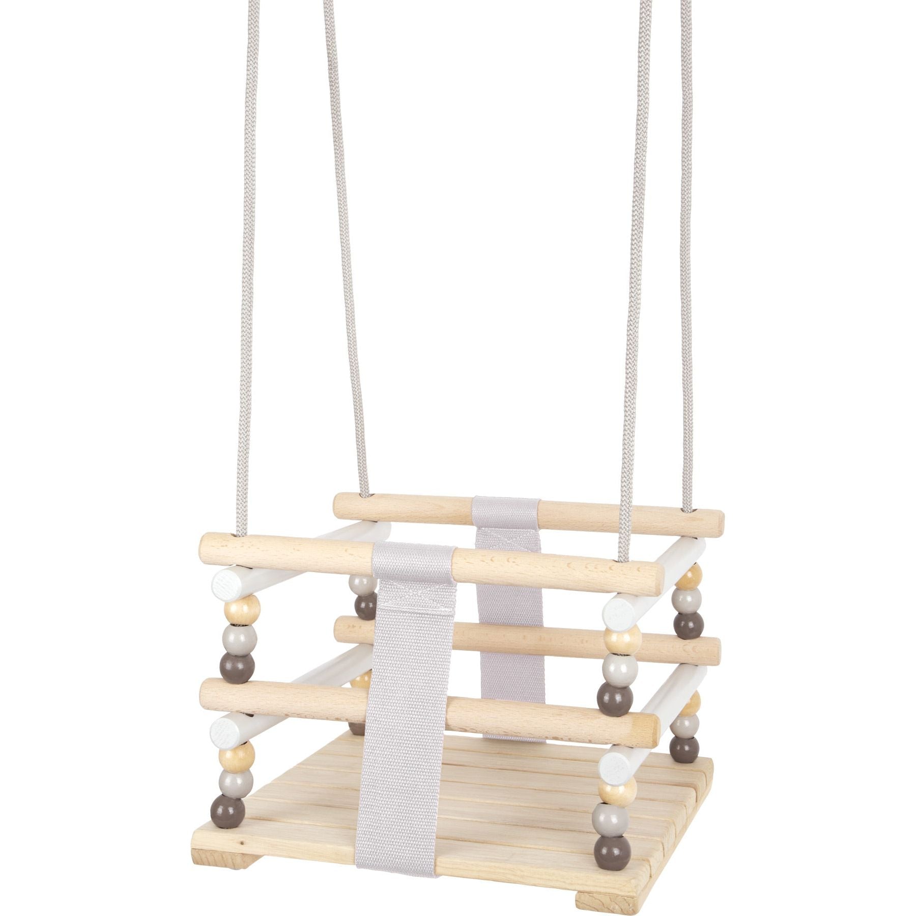 This semi-enclosed swing in a minimalist Scandinavian style promises to bring all kinds of swinging fun to babies and infants. The four closed sides and two tear-proof straps provide the maximum amount of safety. Thanks to the simple gray colour and the high amount of natural, smooth and soft wood material allows this swing to make a great visual impression indoors and outdoors. An absolutely classic swing in a modern look for the youngest kids!