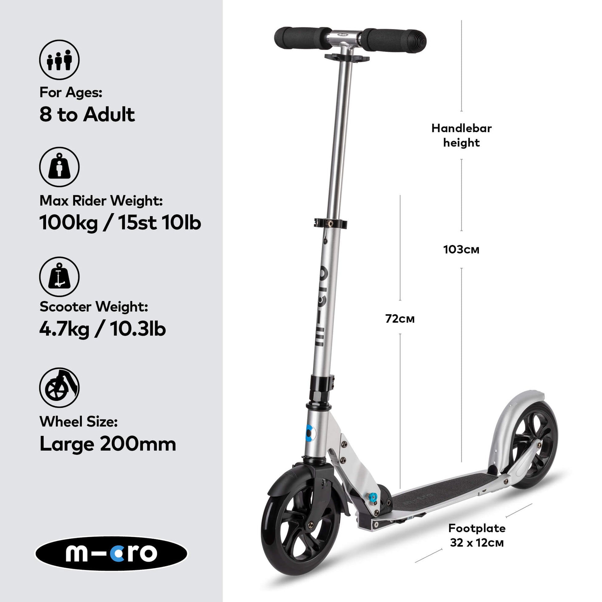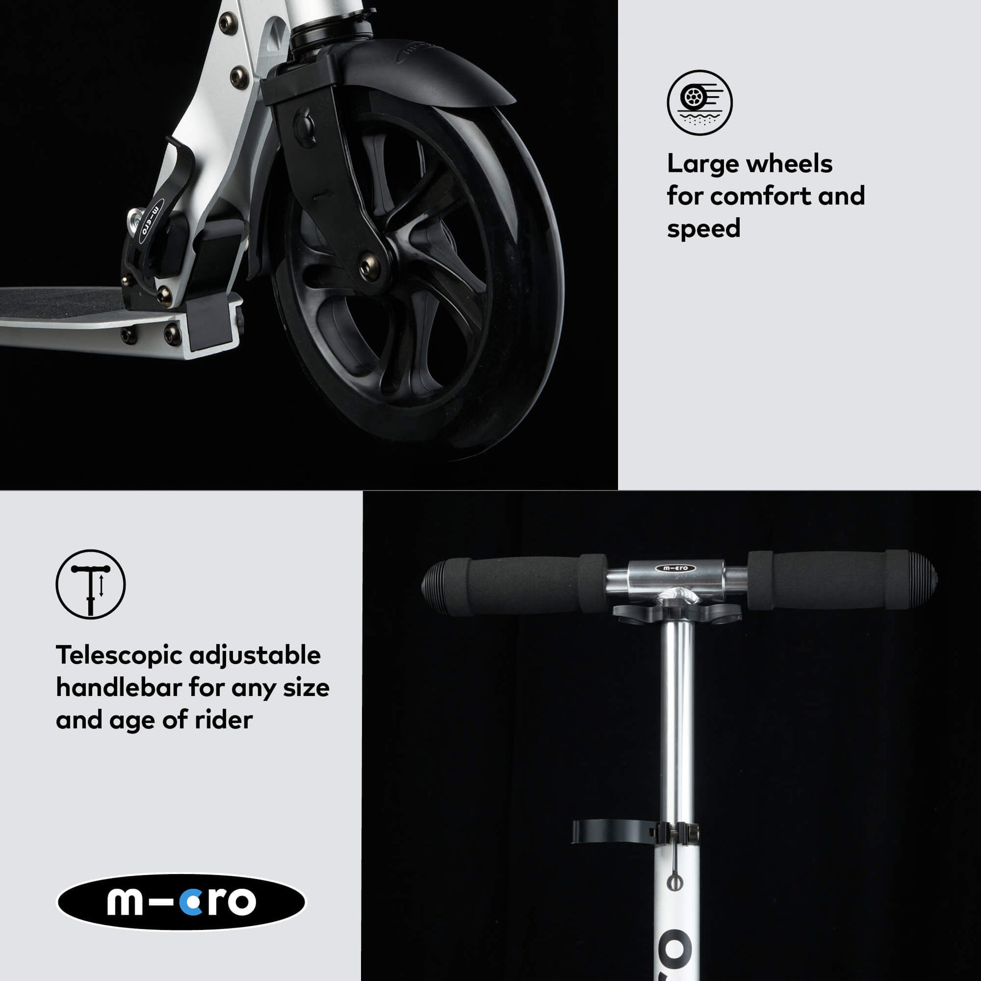 With adjustable handlebars for a tailored scooting position. Seamless one-click fold for easy storage or transportation. And handy kickstand for independent standing. The Micro Classic is a fantastic everyday scooter to make A-B journeys quick, fun and fuss-free.