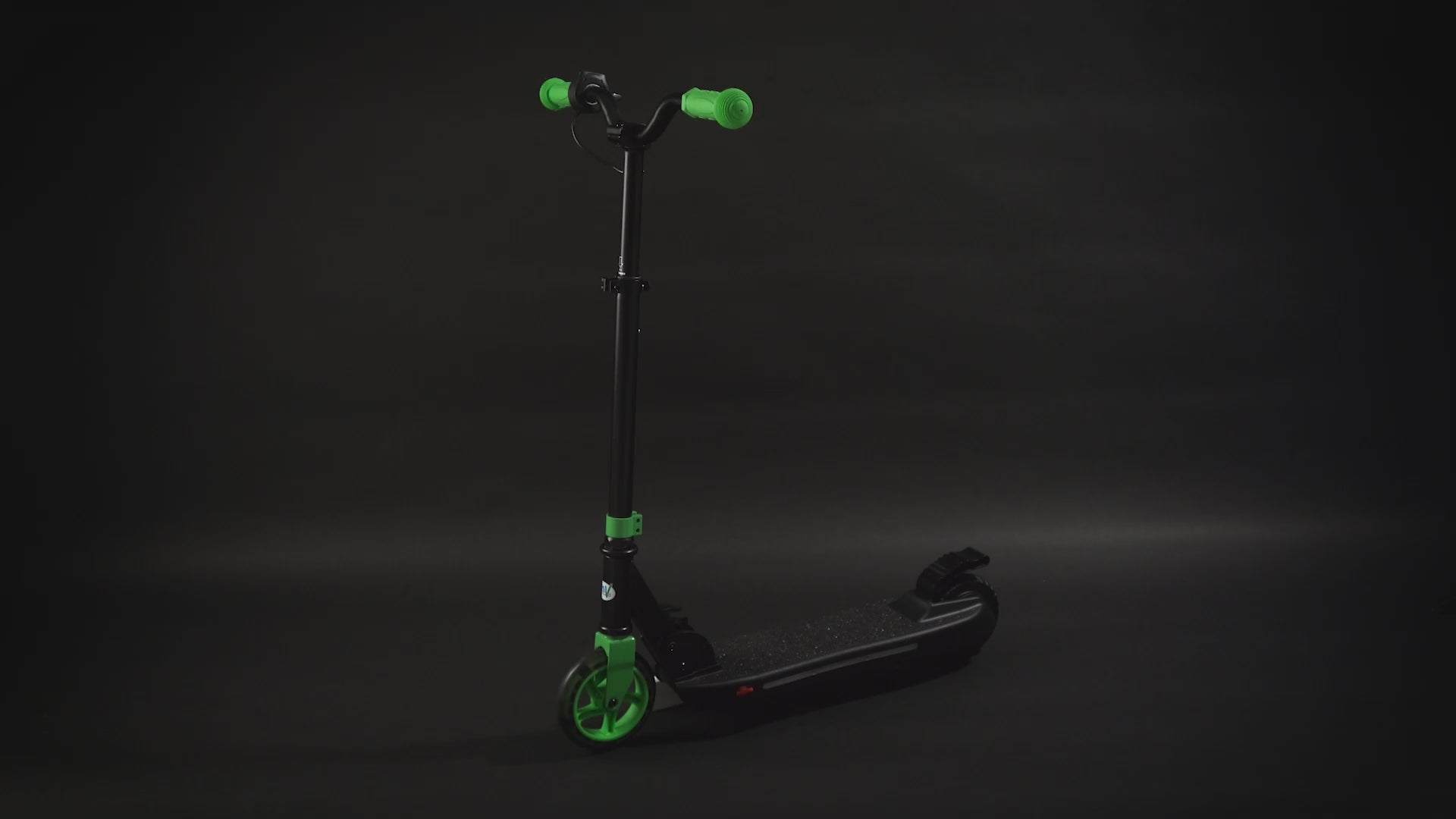 Features an anti-slip deck and reactive rear footbrake, providing secure footing and reliable stopping power. Adjustable handlebar height ensures a comfortable and tailored fit for growing children. Get ready to gow and ride in style with the MoVe 120 Glow Black and Green Electric Scooter!