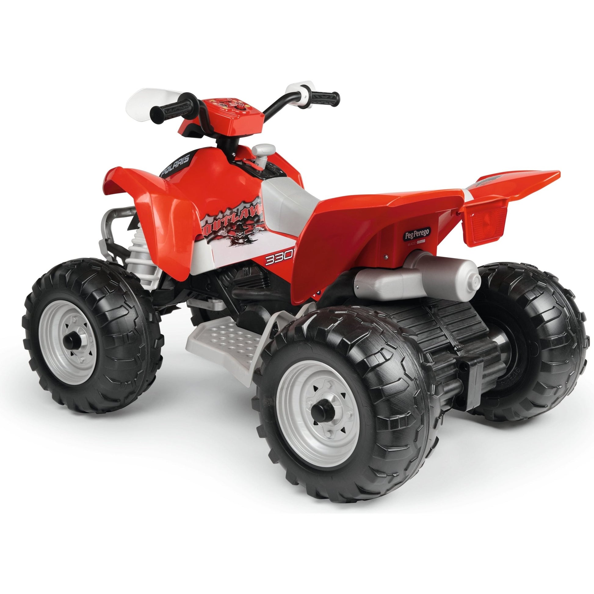 The electric quad for children with lights and sounds, for exciting off-road adventures. The Peg Perego Polaris Outlaw 330W is always ready for new adventures. And what adventures! AlI-Italian quality and high-performing characteristics such as lights, sounds, tunes and a horn, for great fun from the age of 3. The Peg Perego electric quad operates with a 12 V/8Ah/100 Wh rechargeable battery.