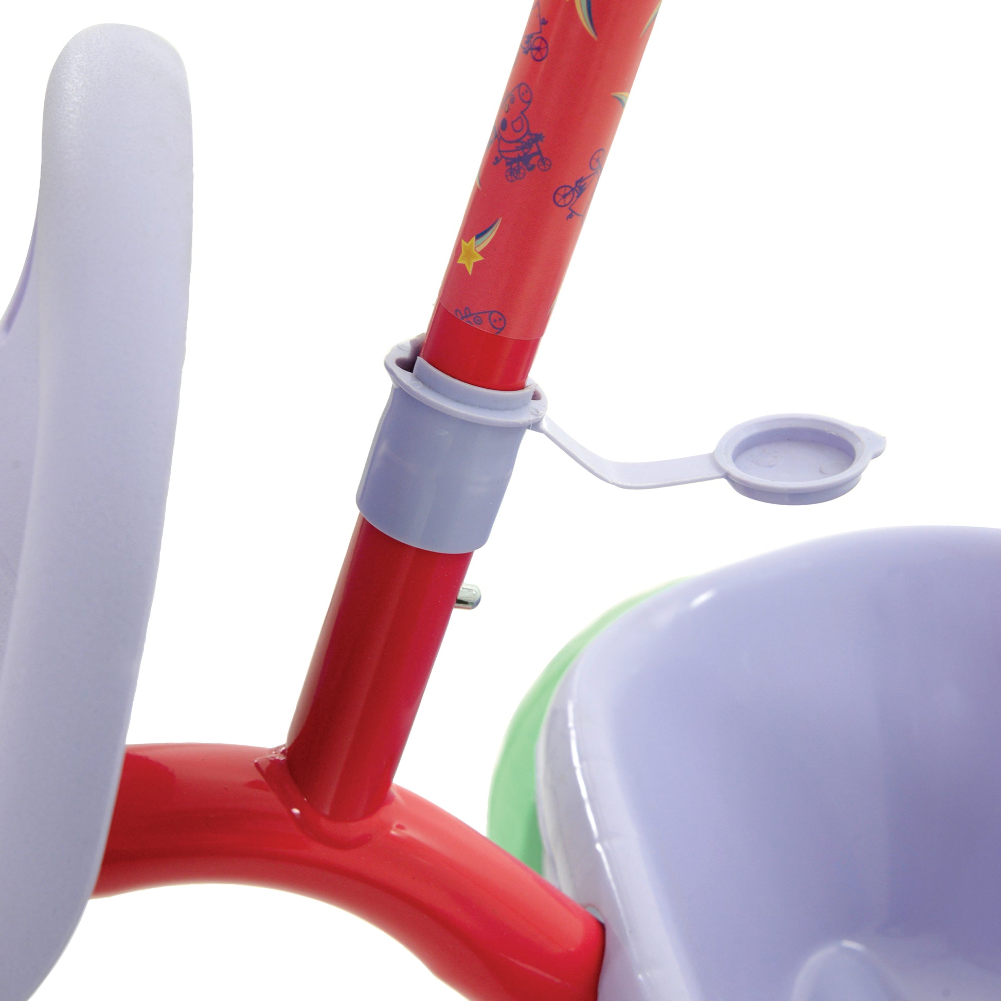 Get on the move with this super cool Peppa trike featuring character favourites! Perfect for little ones finding their feet, this ride-on is not only designed for comfort with it's moulded seat and soft handlebar grips, but safety also with wide, puncture-proof EVA tyres for stability and sturdy steel frame. A front mudguard prevents riders from getting too messy and protects from debris. The easy switch front wheel clutch mechanism allows kids to rest their feet on the pedals in parent push-along mode, whilst using the adjustable parent handle. The handle can be removed and pedals engaged once your child is ready to go it alone, improving confidence and coordination. Can be adjusted to growing children as confidence and ability improves with adjustable handlebar height of 50-53cm and a seat height of 32cm. The removable rear bucket is great for ride-along storage for all your favourites toys!- Depth: 44 CM