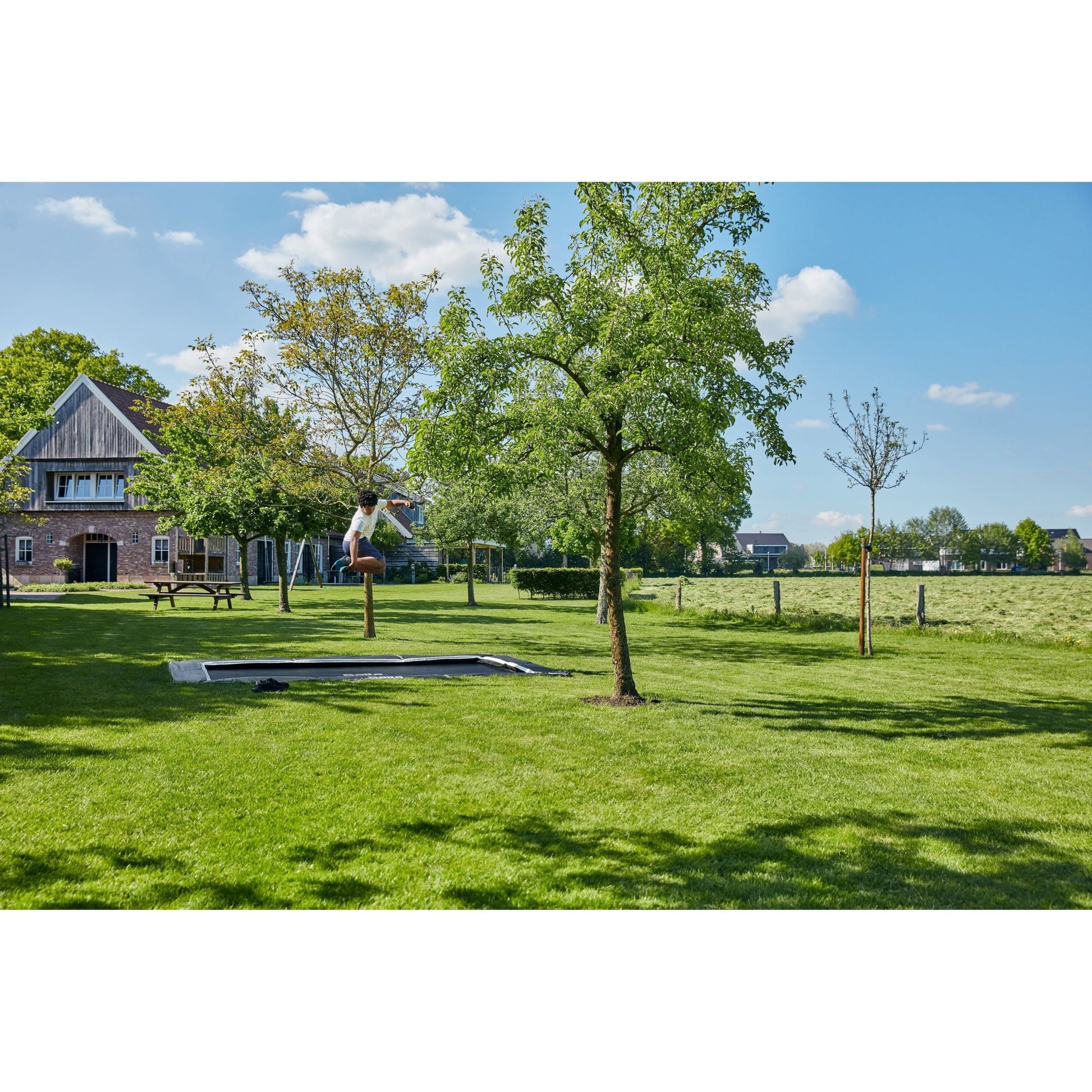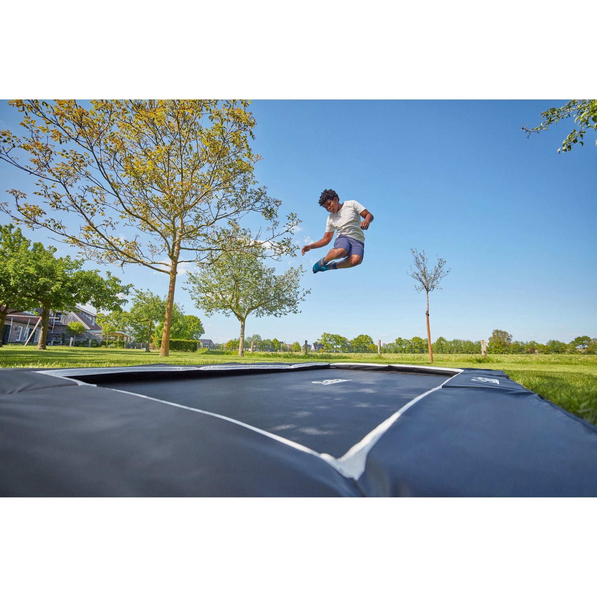 The outside of the Royal Basegroud is equipped with sturdy panels, ensuring a very stable foundation. The durable, sturdy frame and double galvanised frame is black powder coated to fight corrosion. The black safety pad is made from solid, high-quality PVC material. The convenient net system attached to the safety pad, makes it impossible for children to come into contact with the springs. Furthermore, the safety pad seamlessly blends with your grass, making the frame invisible and allowing children to easily access the trampoline.