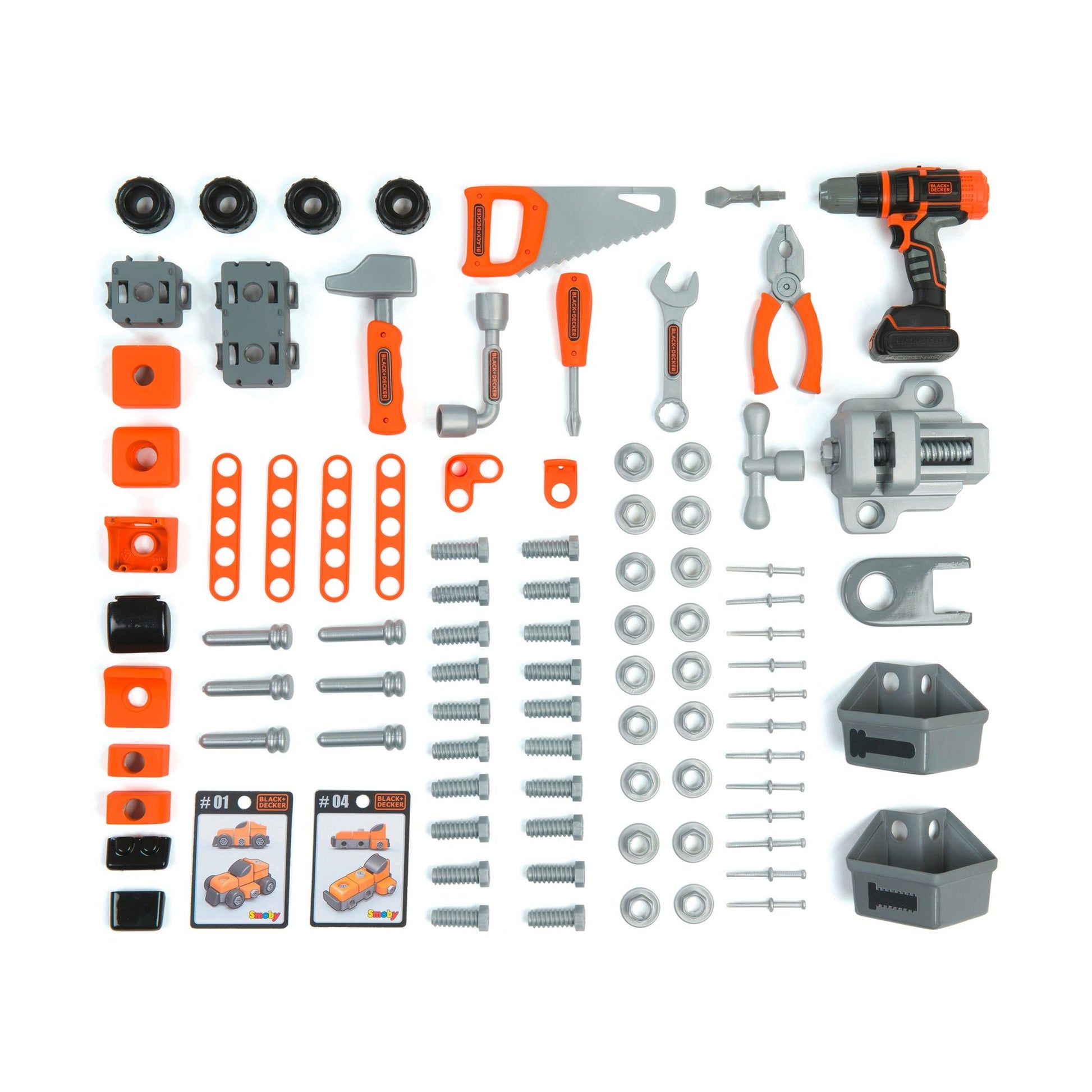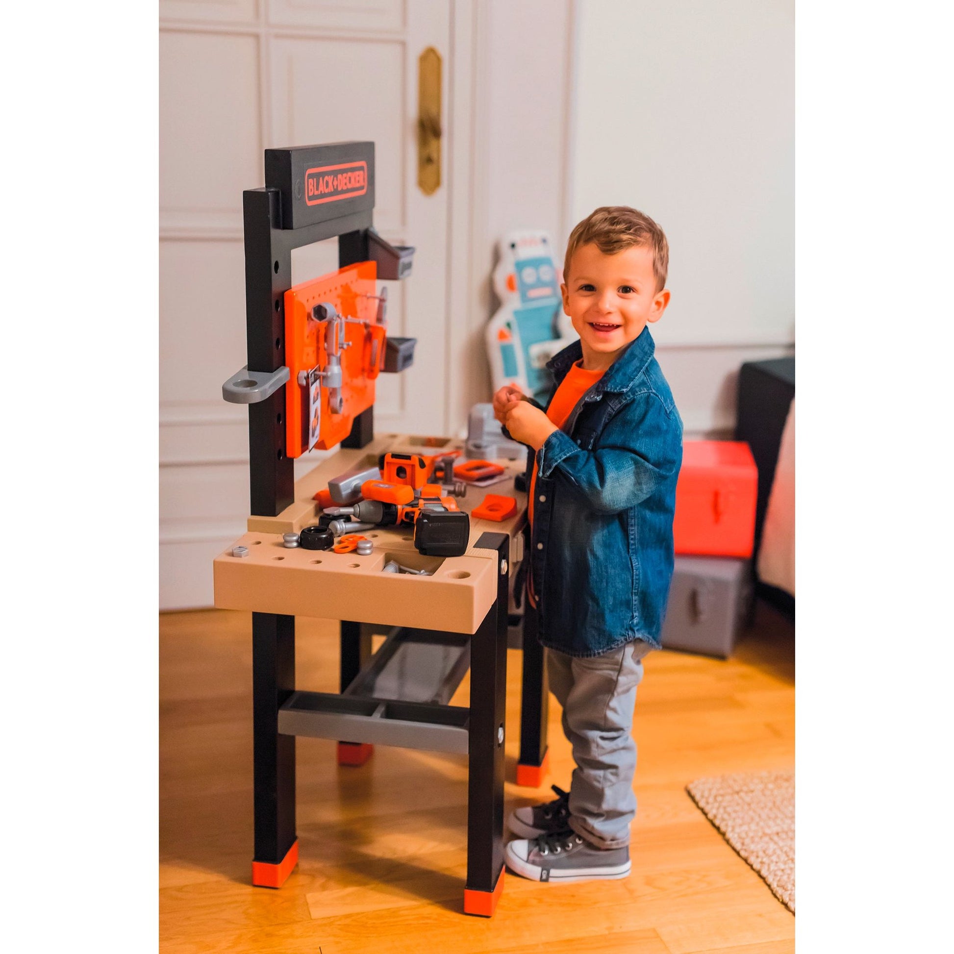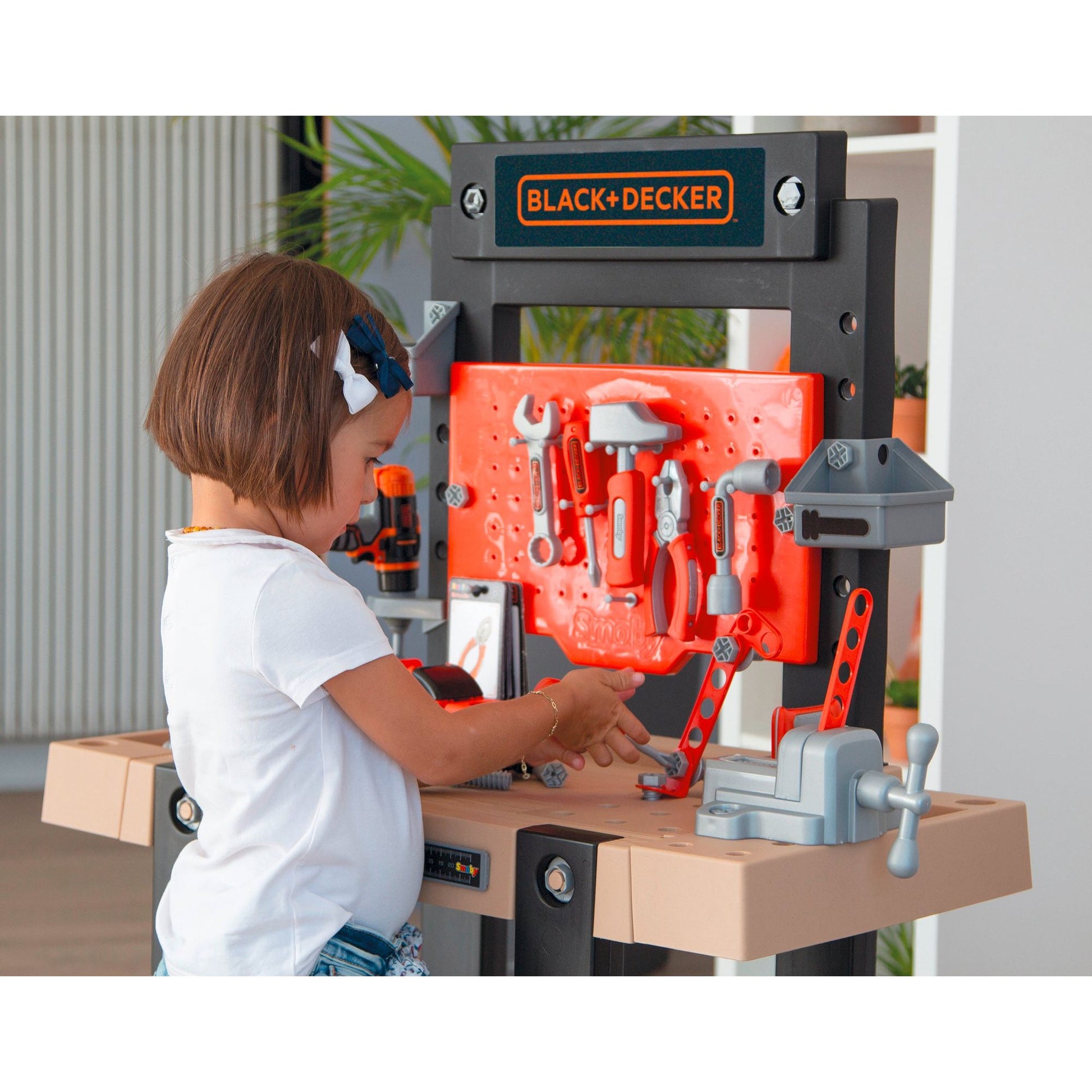 The Black & Decker Bricolo Centre presents many play possibilities! It will enable you to reproduce all your dad and mum's moves! With all the tools you need, it's perfect to grasp DIY functions. You will be able to entertain yourself by building a car, assembling objects or playing with the pushing nail function. Composed of 92 accessories, the workbench has 7 tools, 1 mechanical drill, screws, nuts, nails, construction planks, 1 mechanical ruler. All accessories will find their place thanks to the large storage areas with 2 boxes and storage compartments.