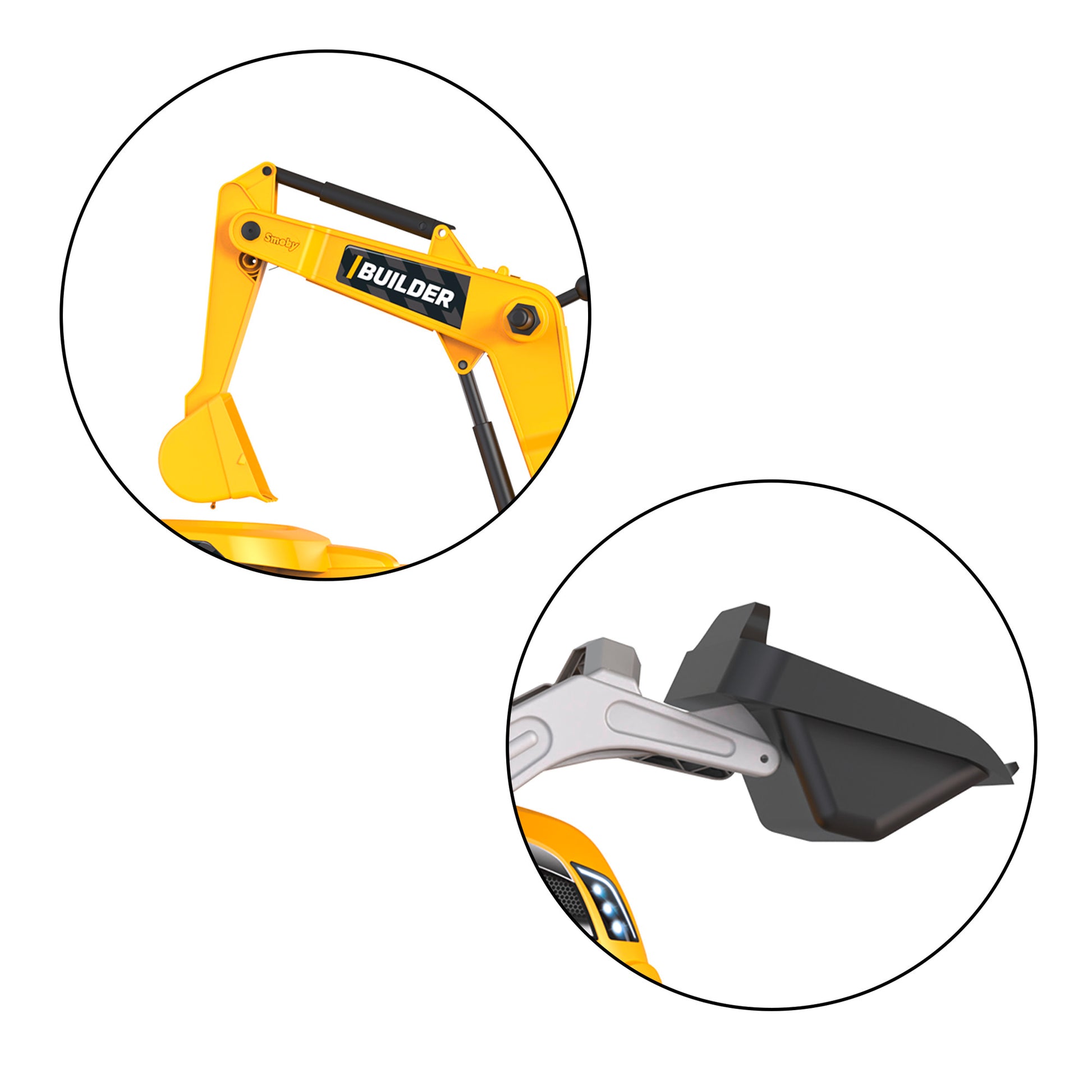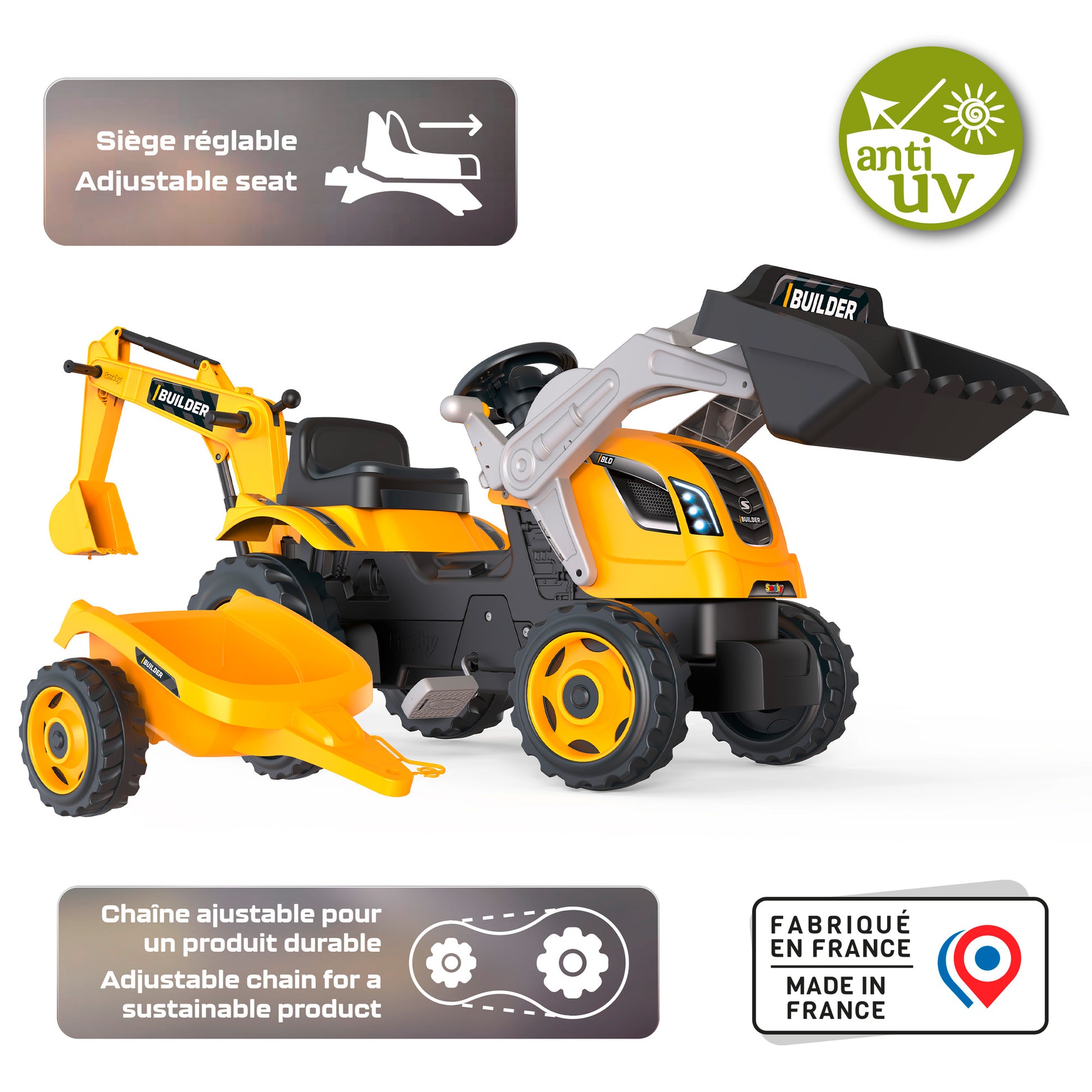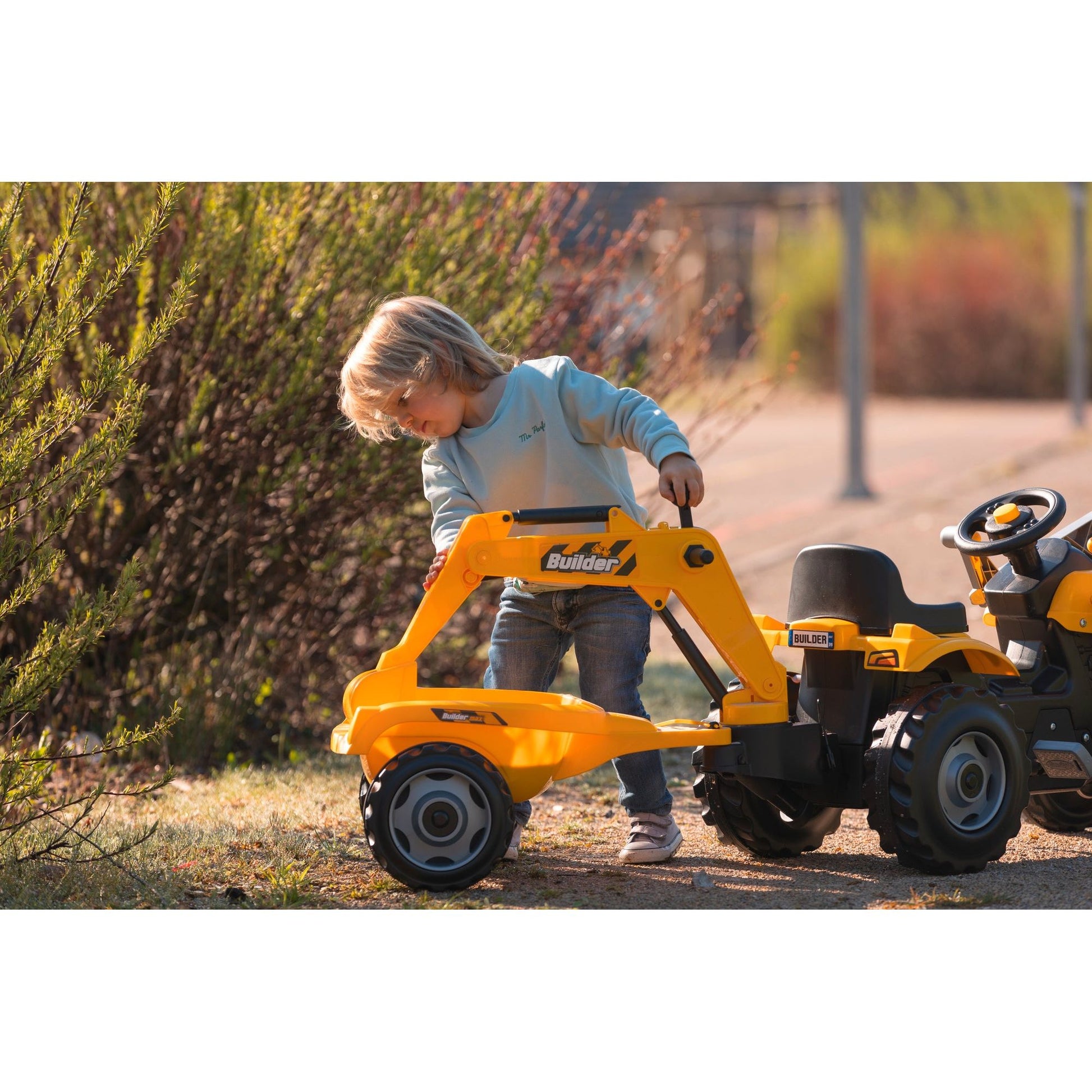 The Smoby Builder Maxx children's pedal tractor & trailer in bright yellow features a rear excavator and multi-moveable loading bucket with a loading volume of 3 kg. The rotating excavator arm is easy to use, so young construction workers can easily load and unload materials. For larger building materials the driver can use the large loading shovel. Using two levers it can be easily raised, lowered, folded in for transport and emptied by tilting.