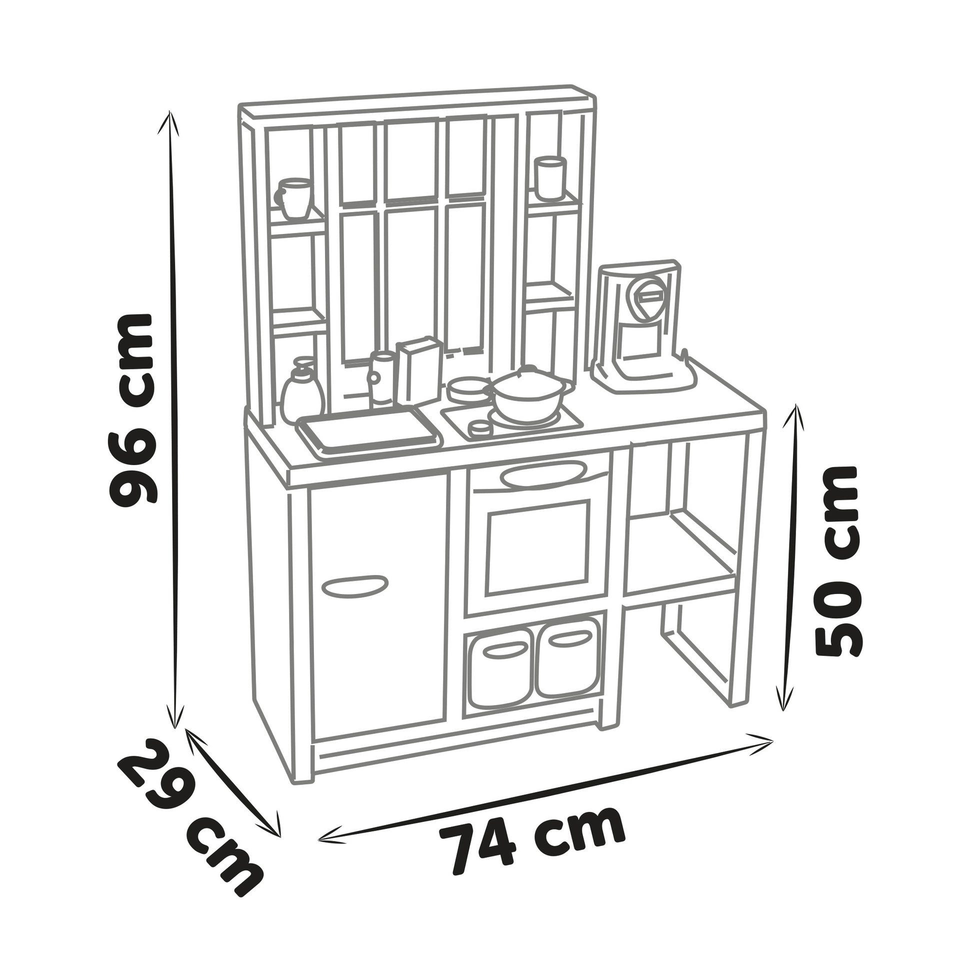 Several spaces will allow the child to do like the grown-ups thanks to the cooking plate, the oven, the fridge, the coffee machine, the sink or the sorting bins. 32 accessories are included: 3 barbecue utensils, 2 forks, 2 knives, 2 spoons, 2 plates, 2 glasses, 2 cups, 3 coffee capsules, 1 frying pan, 1 stewpot, 1 lid, 2 dummy boxes, 1 pancake, 5 heat-sensitive pastas that change color in cold water, 1 salt-pepper mill with cric cric function, 2 utensil pots.