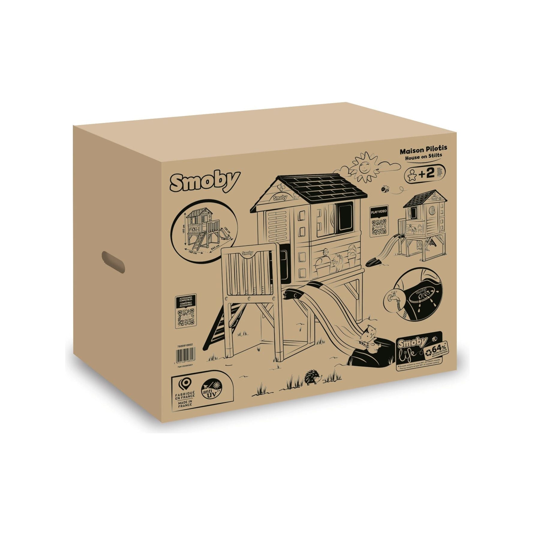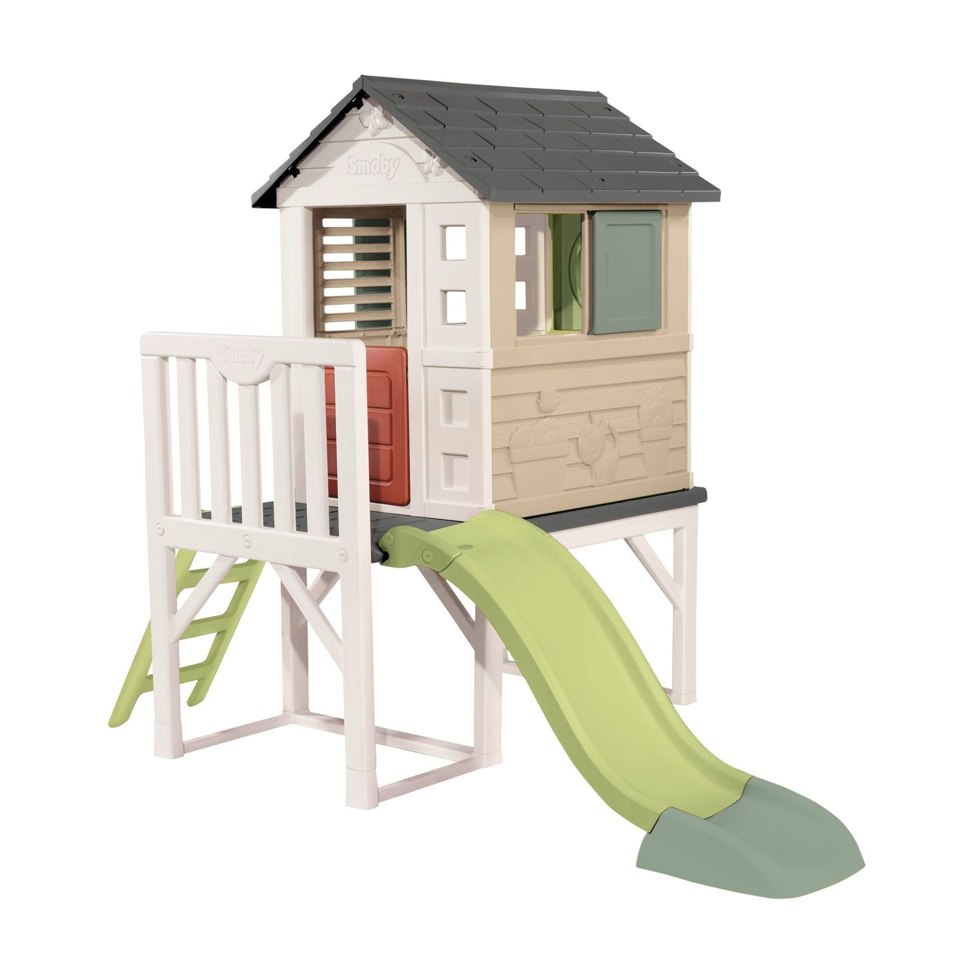 The Smoby Life House on Stilts playhouse is perfect to have fun with friends and develop imagination! Like real adventurers, your children will be able to reach their hut thanks to the ladder. Set on a 70cm high platform, the playhouse gives an unobstructed view of the garden. Thanks to the half door and the 3 windows on the different facades, your little adventurers will have an eye on everything! While one of your children will have fun with the slide, the other will be able to imagine thousand stories on the house’s porch! Your little ones will be able to play hide and seek thanks to the 2 sliding shutters which will enable them to win the game!