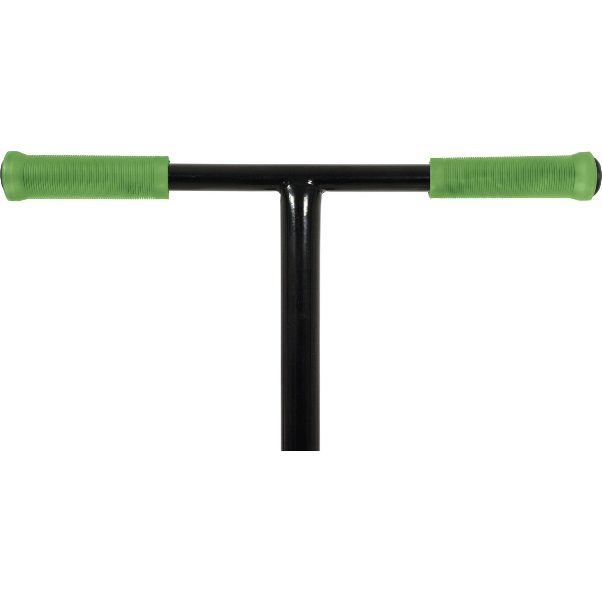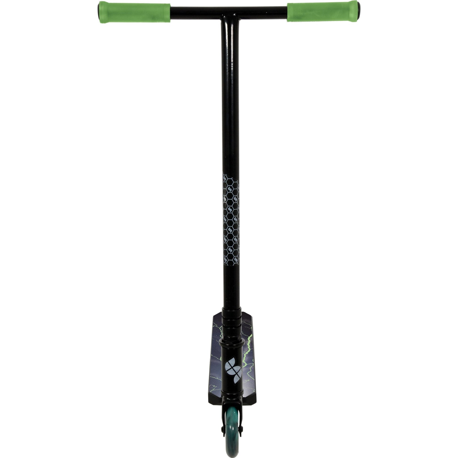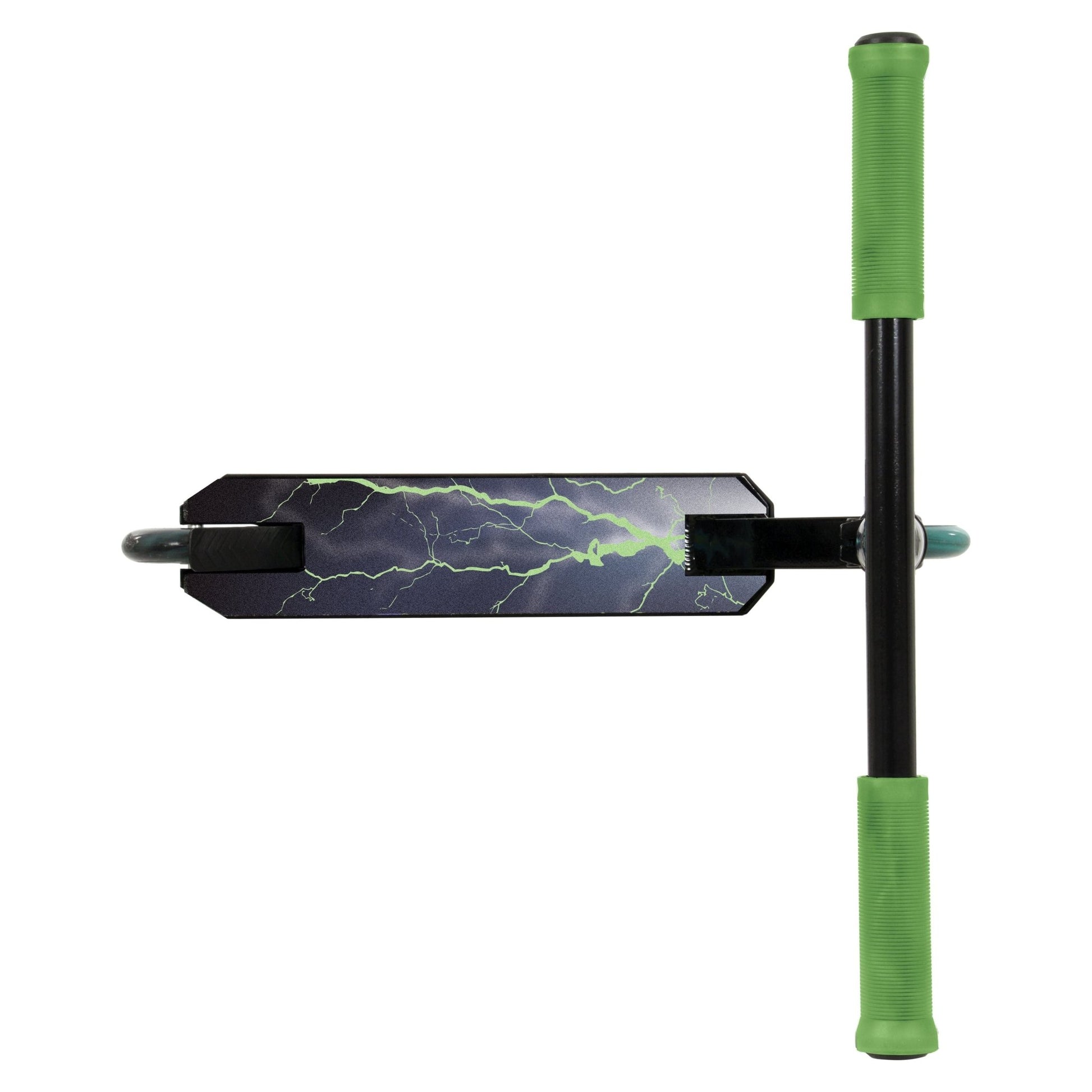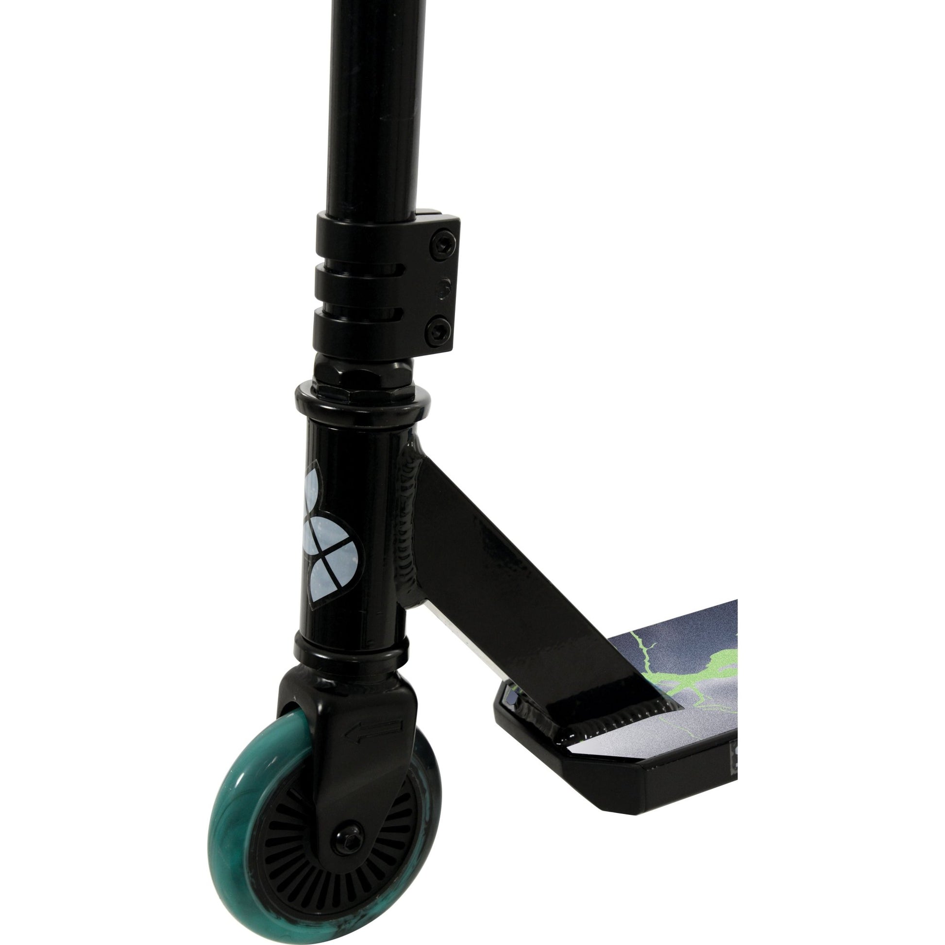 The single piece design of the handlebar and stem along with the pro-grade triple clamp ensures a solid steering base with moulded, glow in the dark grips for comfort. The aluminium box deck offers superb stability at a light weight and therefore great for perfecting tricks like whips. To keep 360° tricks, steering and riding smooth (as well as fast), the scooter features a threaded headset and ABEC 7 wheel bearings. The tyres are constructed from a solid, puncture proof PU cast with PP spoked cores to ensure excellent stability and streamline performance. And when you need to stop, the reactive rear footbrake will 'grind' you to a halt in a smooth and controlled manner.
