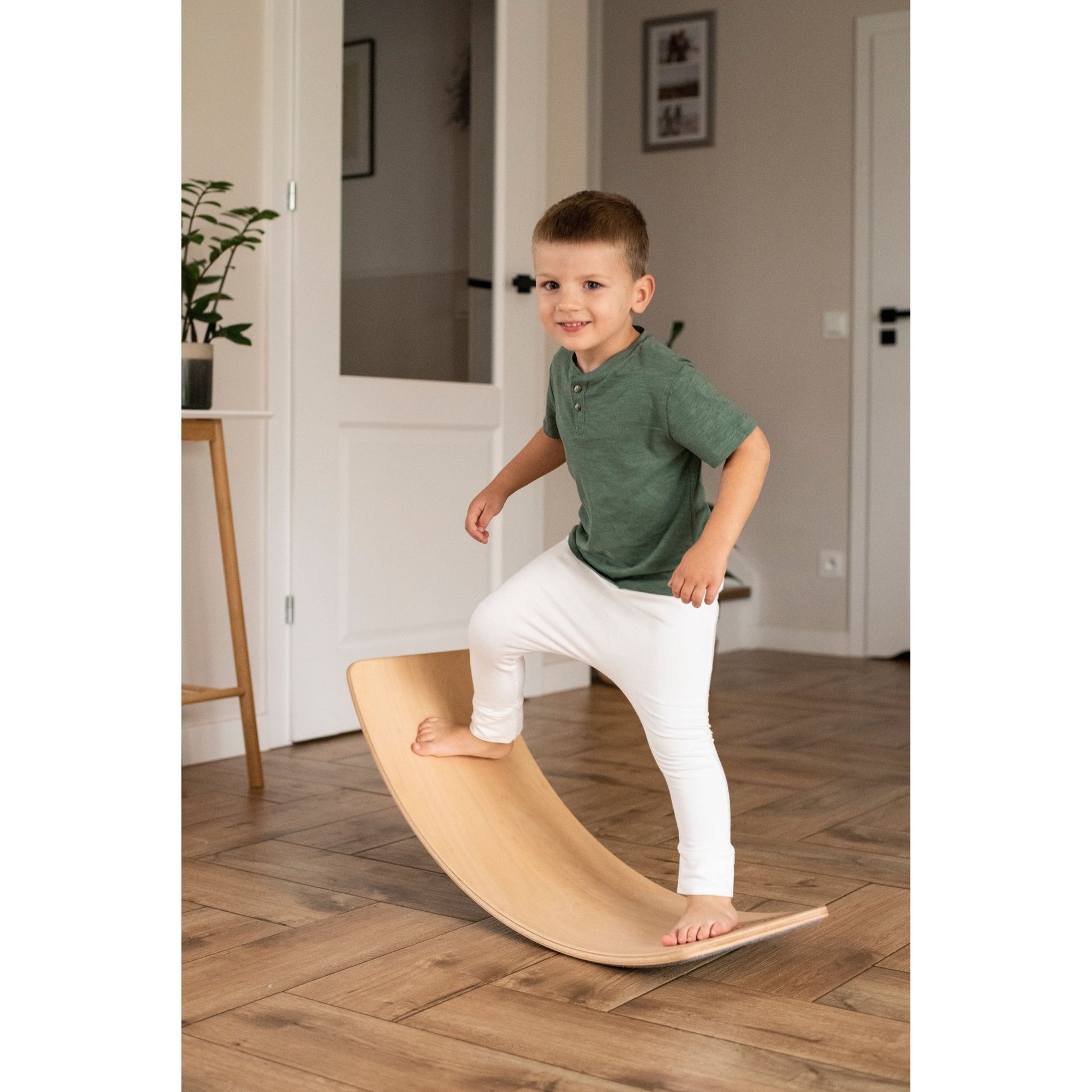 Balance board with felt allows for balancing on hard surfaces and protects both the board and the floor from damage. The felt has a tendency to pile - this is a natural feature of this material and does not affect the functionality of the product. We recommend that you gently clean the felt with a damp cloth and then wipe it dry. Frequent contact with moisture results in felt coming off the board, so make sure that the toy is always dry.